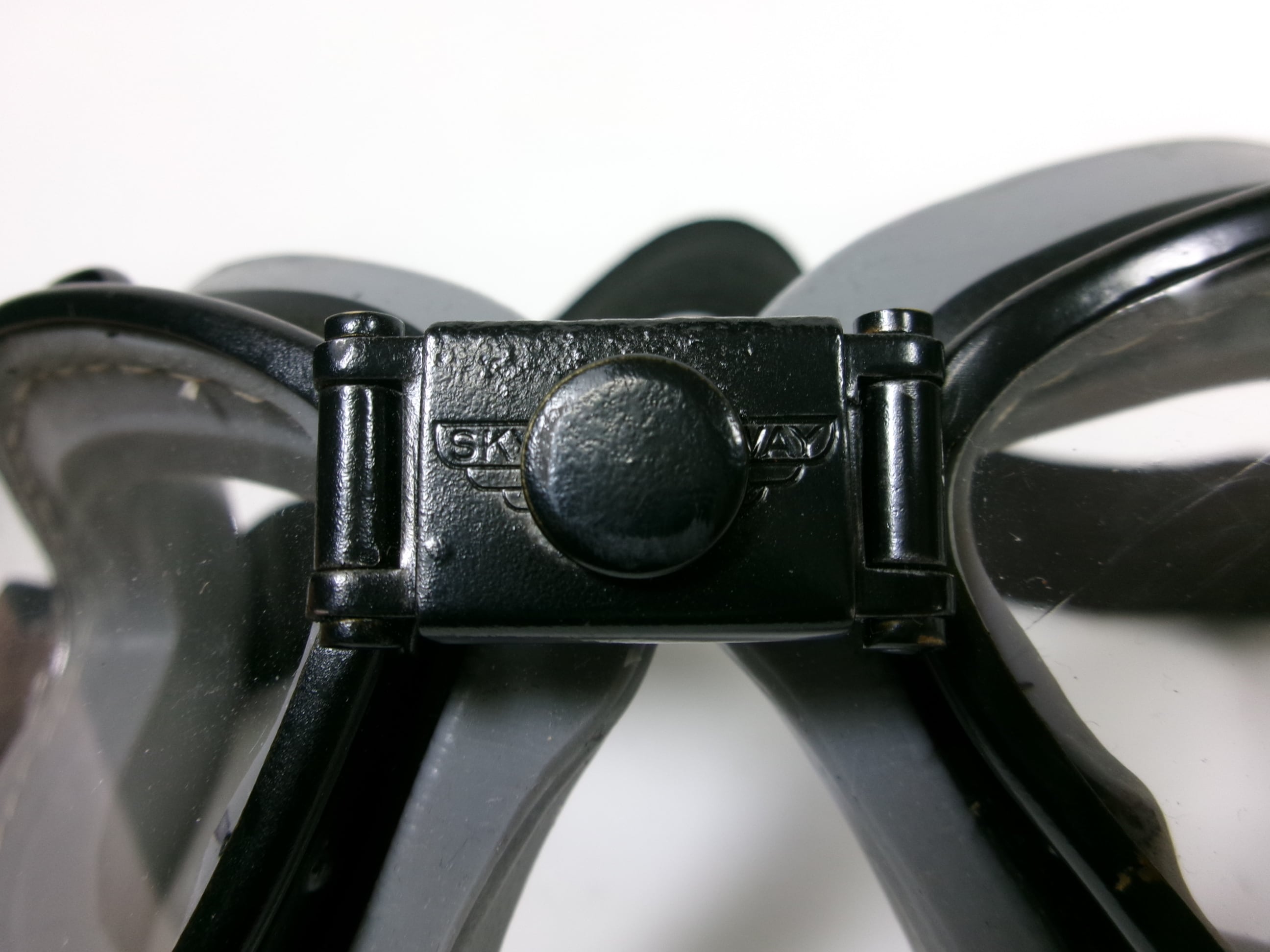 本品は「SKYWAY」の名称が付けられたモデルで、軍規格(AN-6530)に準じた設計をベースに、民間向けにも展開されたタイプと考えられます。特徴的なメタルフレーム、通気ベント、立体的なリム構造など、当時の実用品ならではの無骨な佇まいが魅力です。